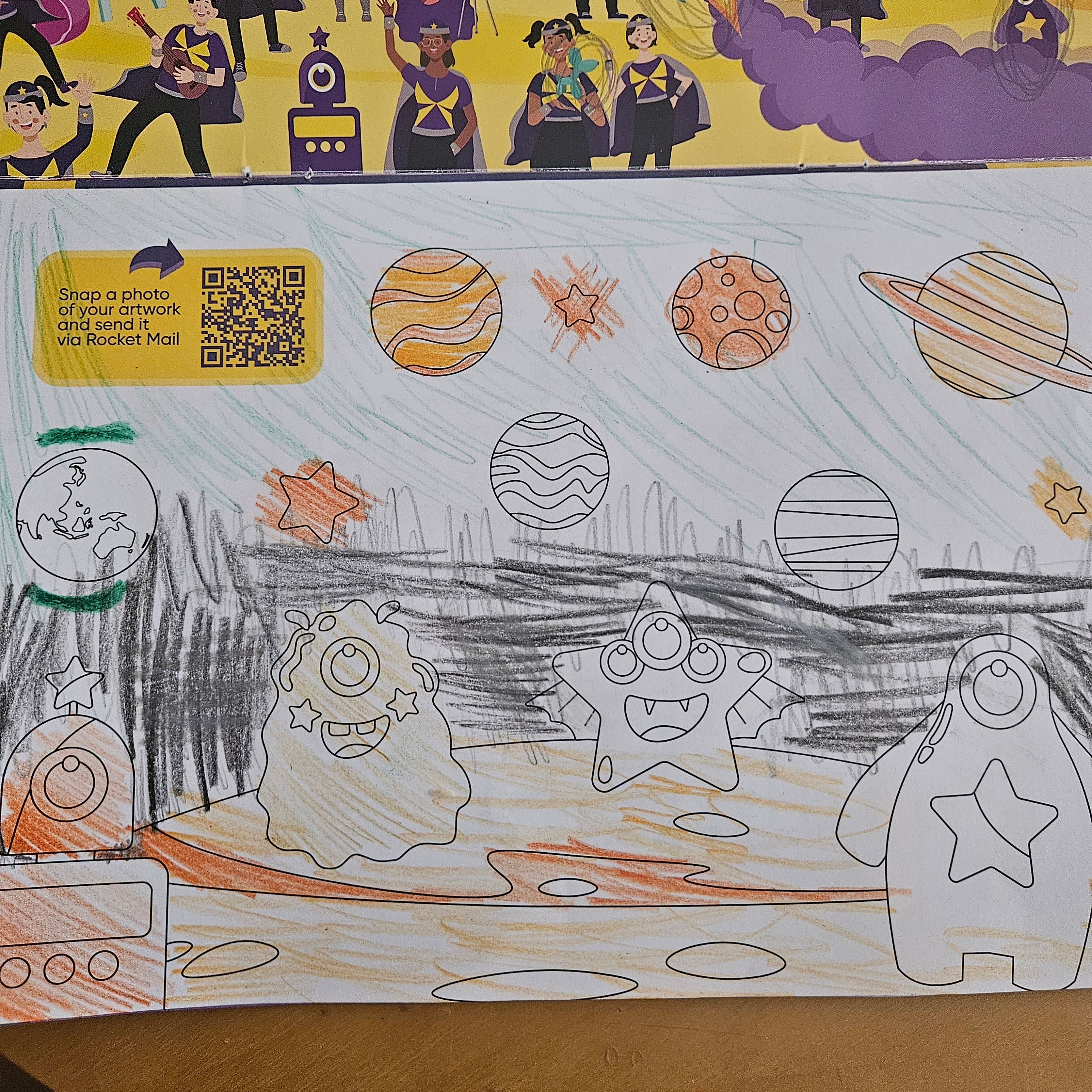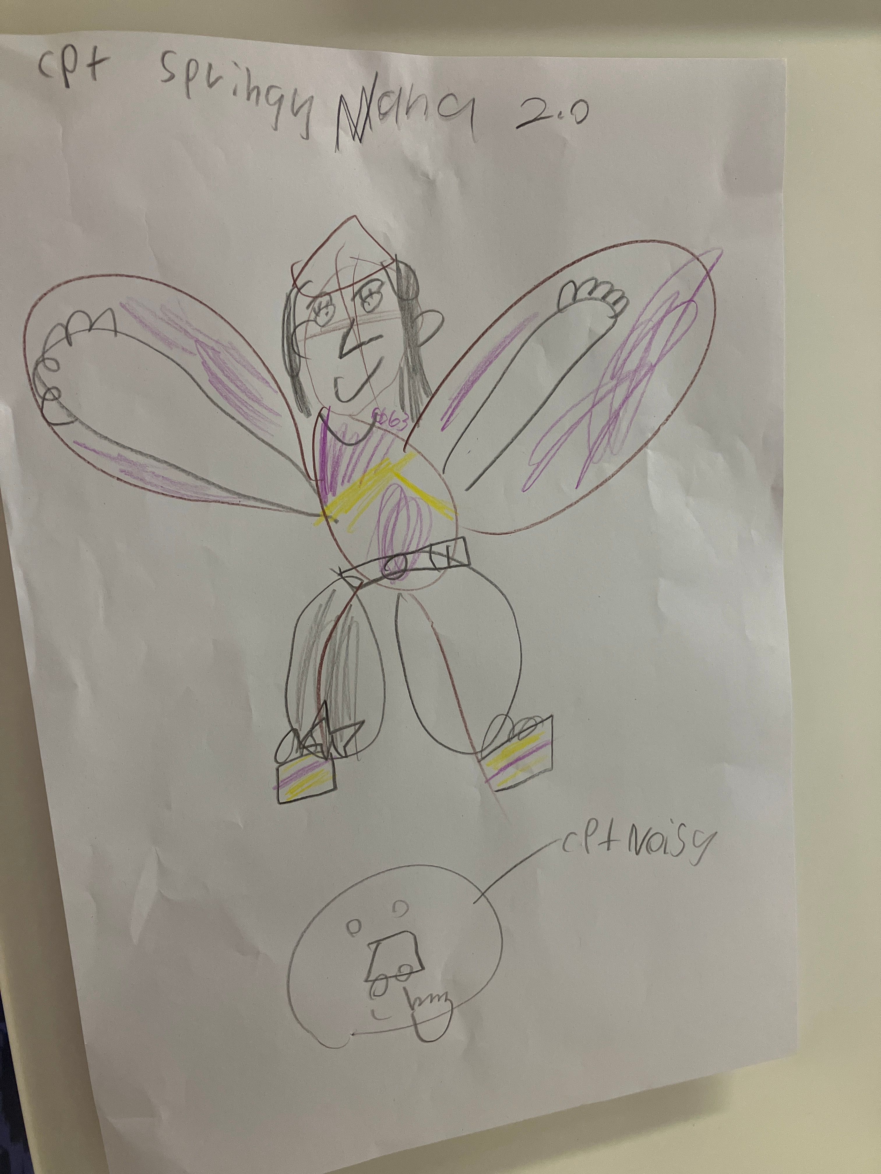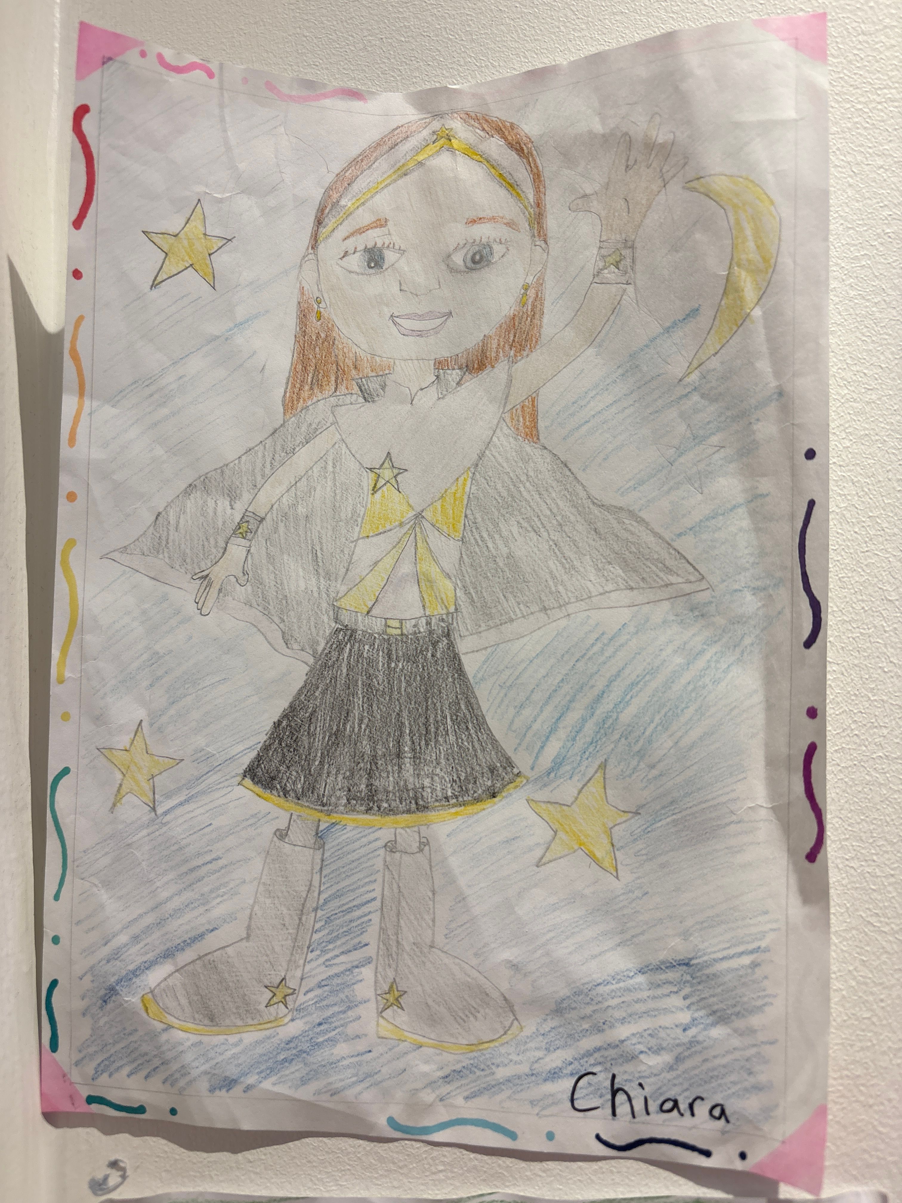 This is the Incredibles art that a bunch of awesome kids in the RCH waiting room made together! It’s got pigs, a secret code, portraits and more!!!